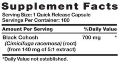Високоякісні добавки чорного кохоша містять еквівалент 700 мг цієї традиційної трави в капсулах з швидким вивільненням. Ці добавки підтримують здоровий перехід в менопаузу, а також допомагають полегшити деякі загальні симптоми цього тілесного зміни у жінок, такі як припливи, нічна пітливість, легкі зміни настрою і періодична безсоння.