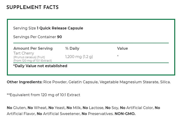Капсули добавки Nature's Truth Tart Cherry Extract забезпечують еквівалент 1200 мг терпкою вишні на порцію, який допомагає боротися з руйнують клітини дією вільних радикалів в організмі.