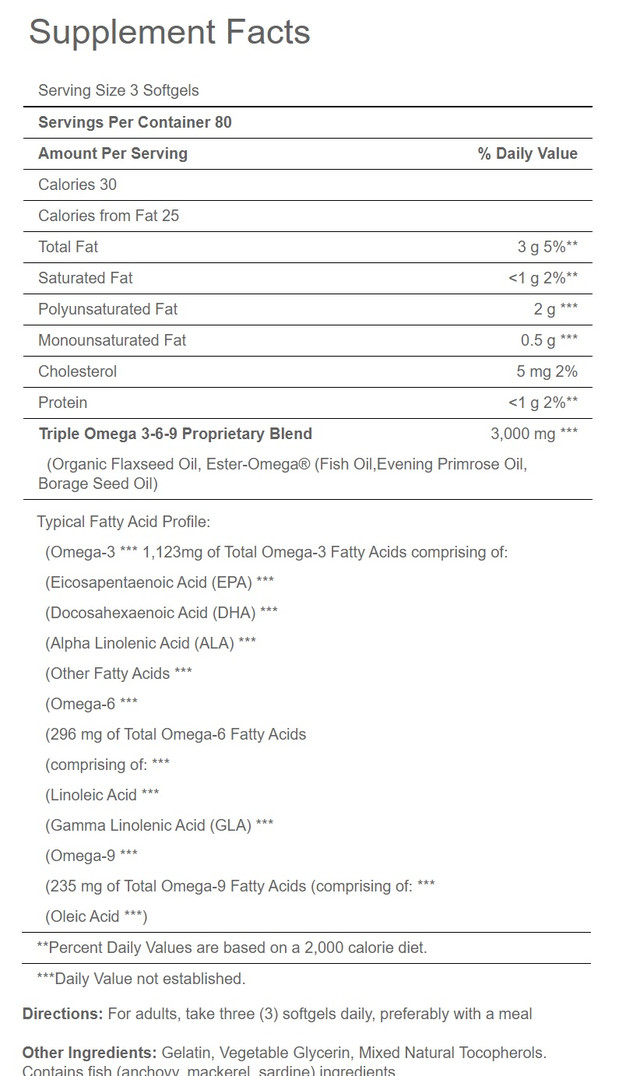 Жирні кислоти Triple Omega 3-6-9 – біологічна активна добавка, комплекс Омега-3, Омега-6 і Омега-9, що доставляє в організм незамінні поліненасичені жирні кислоти для максимальної активності і здоров'я! Потрібна для росту м’язової маси та схуднення.