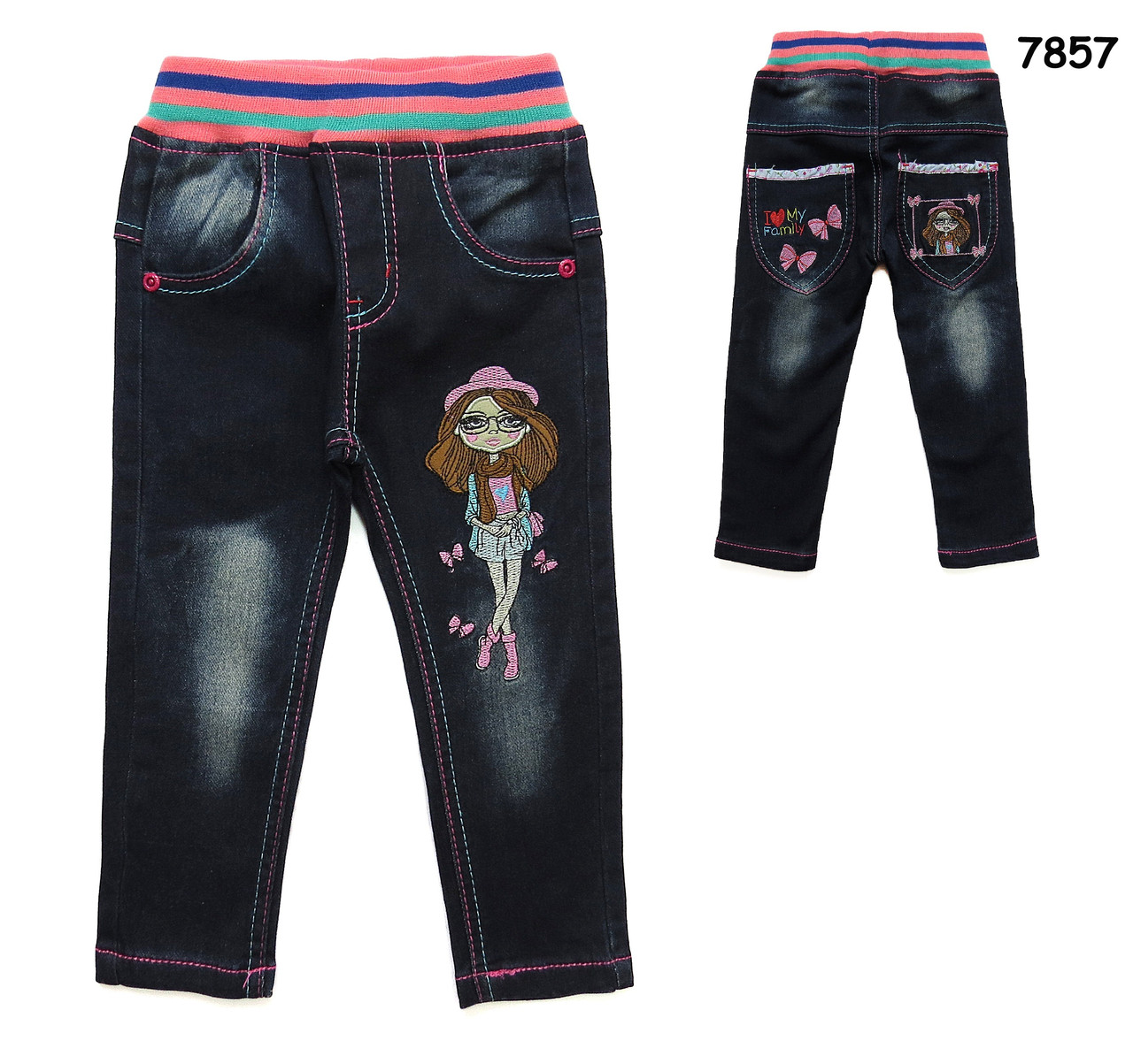Джинси для дівчинки. Прикрашені нашивками, вишивкою і вставками з тканини. Пояс на широкій резинці.